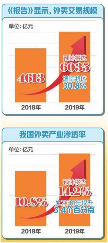 去年12月,美团研究院和中国饭店协会联合发布了《中国外卖产业调查研究报告》。《报告》显示,在2018年交易额4613亿元的基础上,2019年外卖规模预计将达6035亿元,增幅将达30.8%,外卖产业的快速发展为整个餐饮行业注入了新动能。