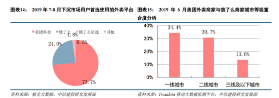 另据Trustdata移动大数据监测平台显示,三线及以下城市中双方平台商户重合显著少于一二线城市,证明低线城市更多商户为单平台商户,动摇较少,粘性较强,在低线城市美团的先发优势更加明显。