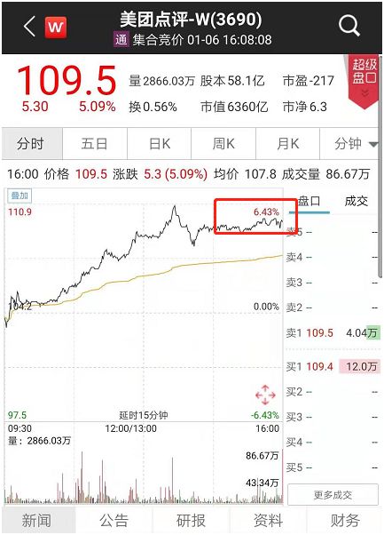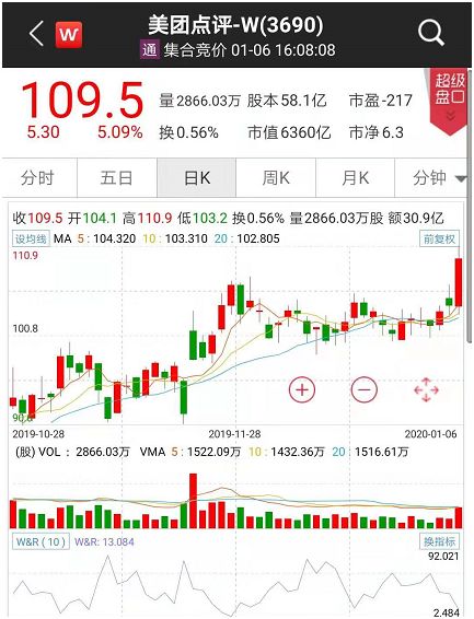 截至当日收盘,美团点评涨幅超5..09%,股价报收109.5港元,市值6360亿港元。